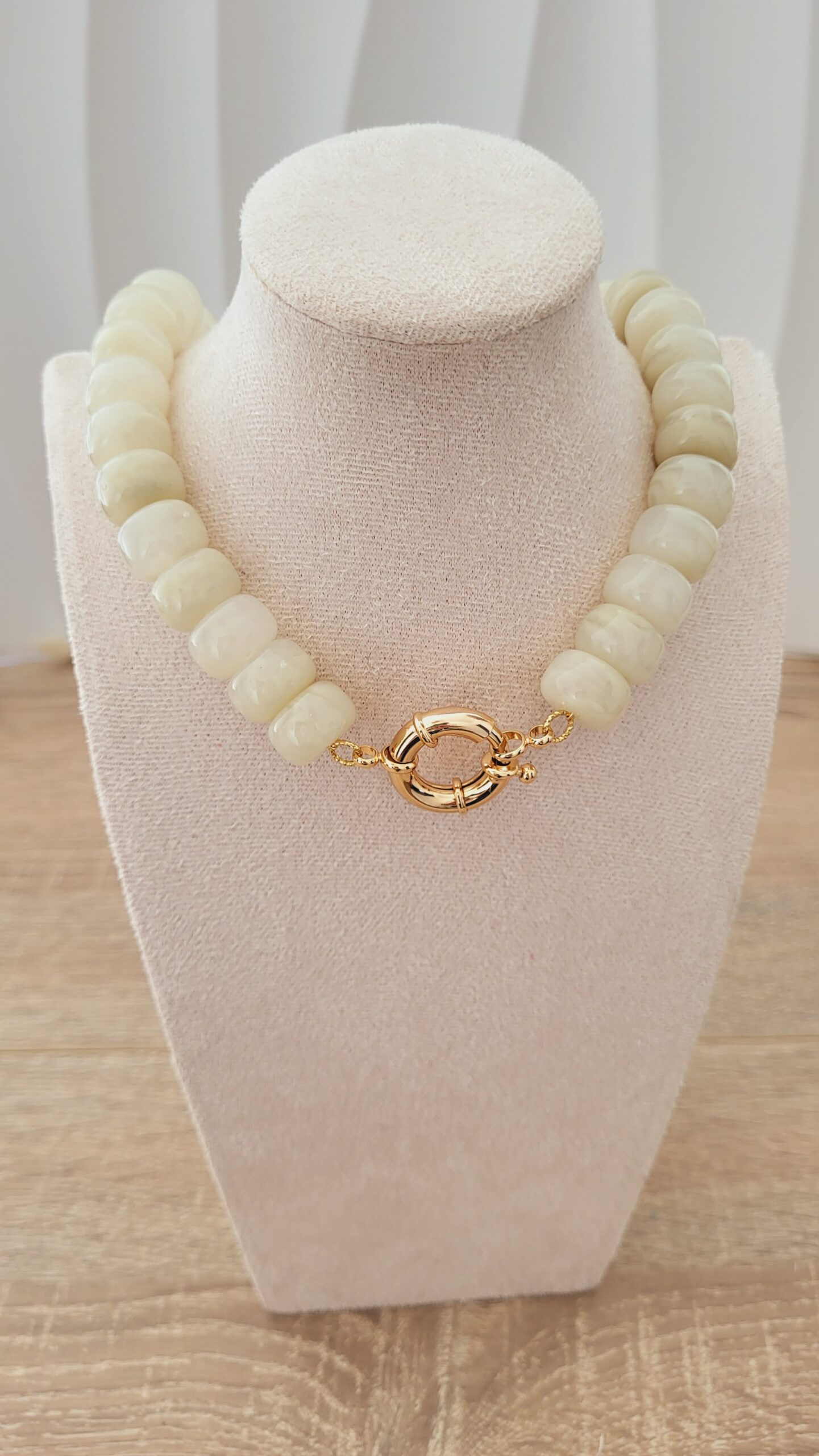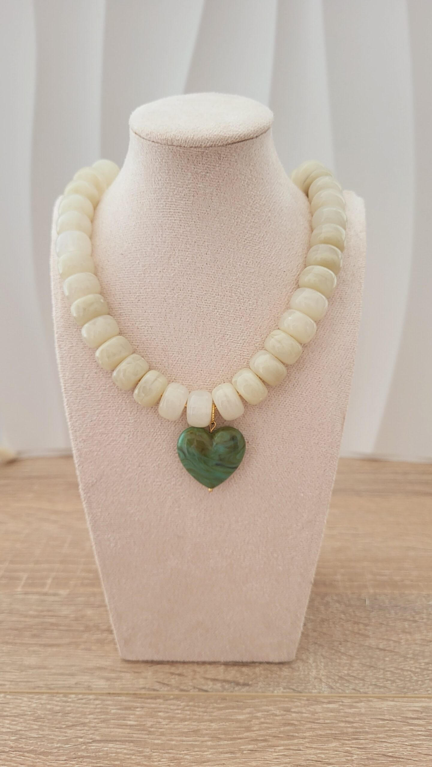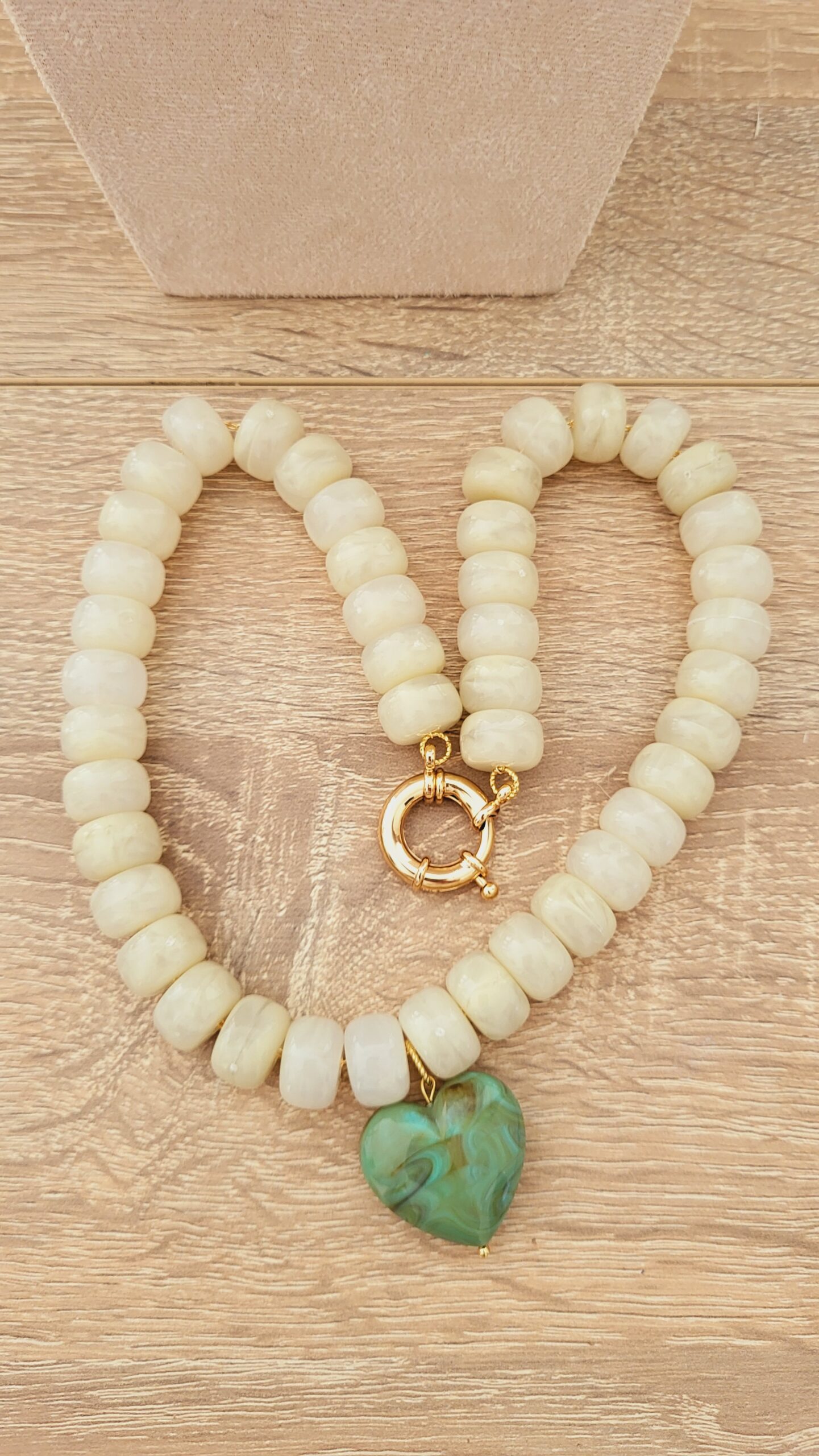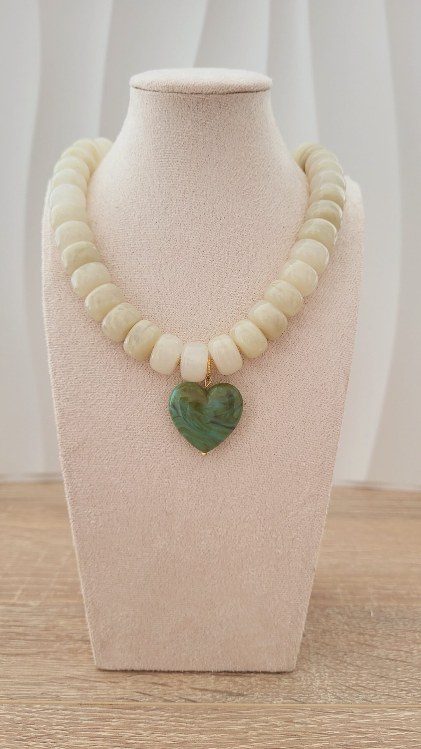 ✨️ Le collier Marius est en collier en perles rondelles en acrylique de 14.5x9mm avec un coeur en résine translucide de 26x27mm.