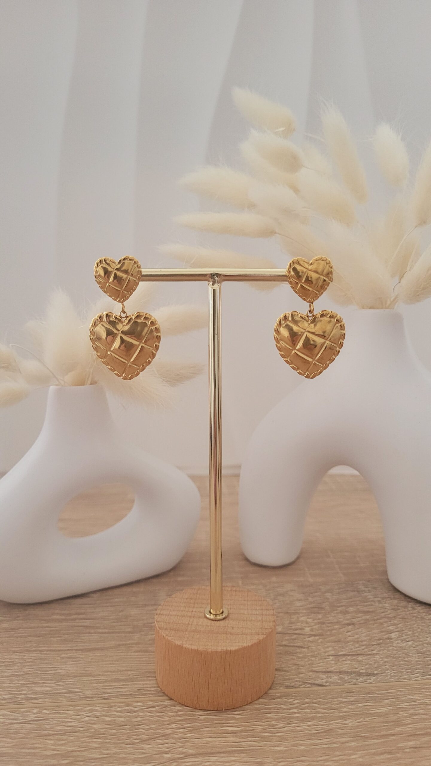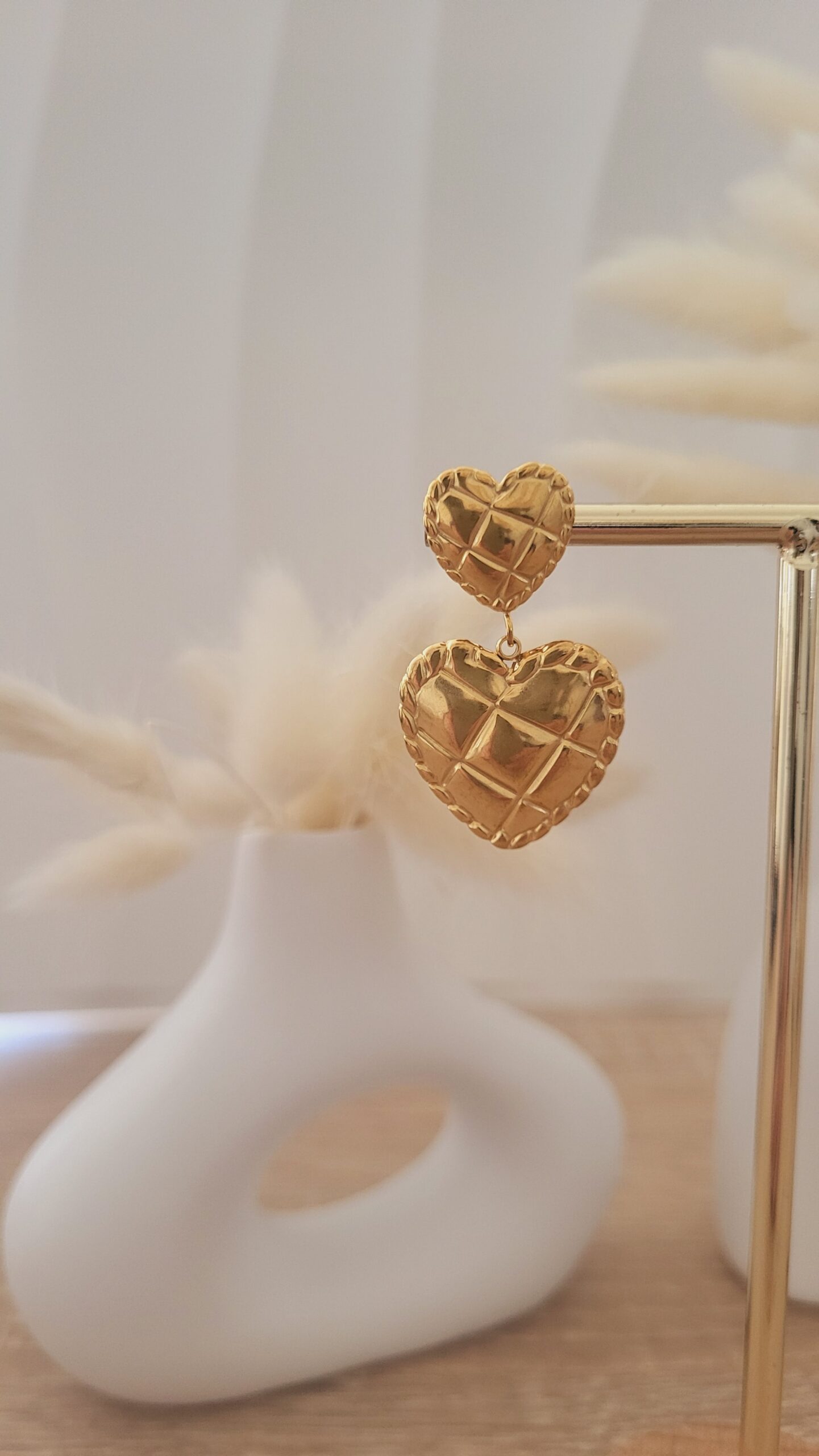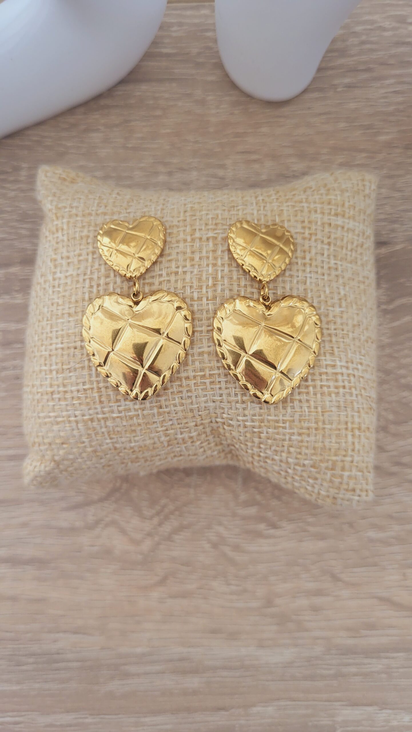 ✨️ Clous d’oreilles effet matelassé forme coeur en acier inoxydable 304L doré de 17x14mm.