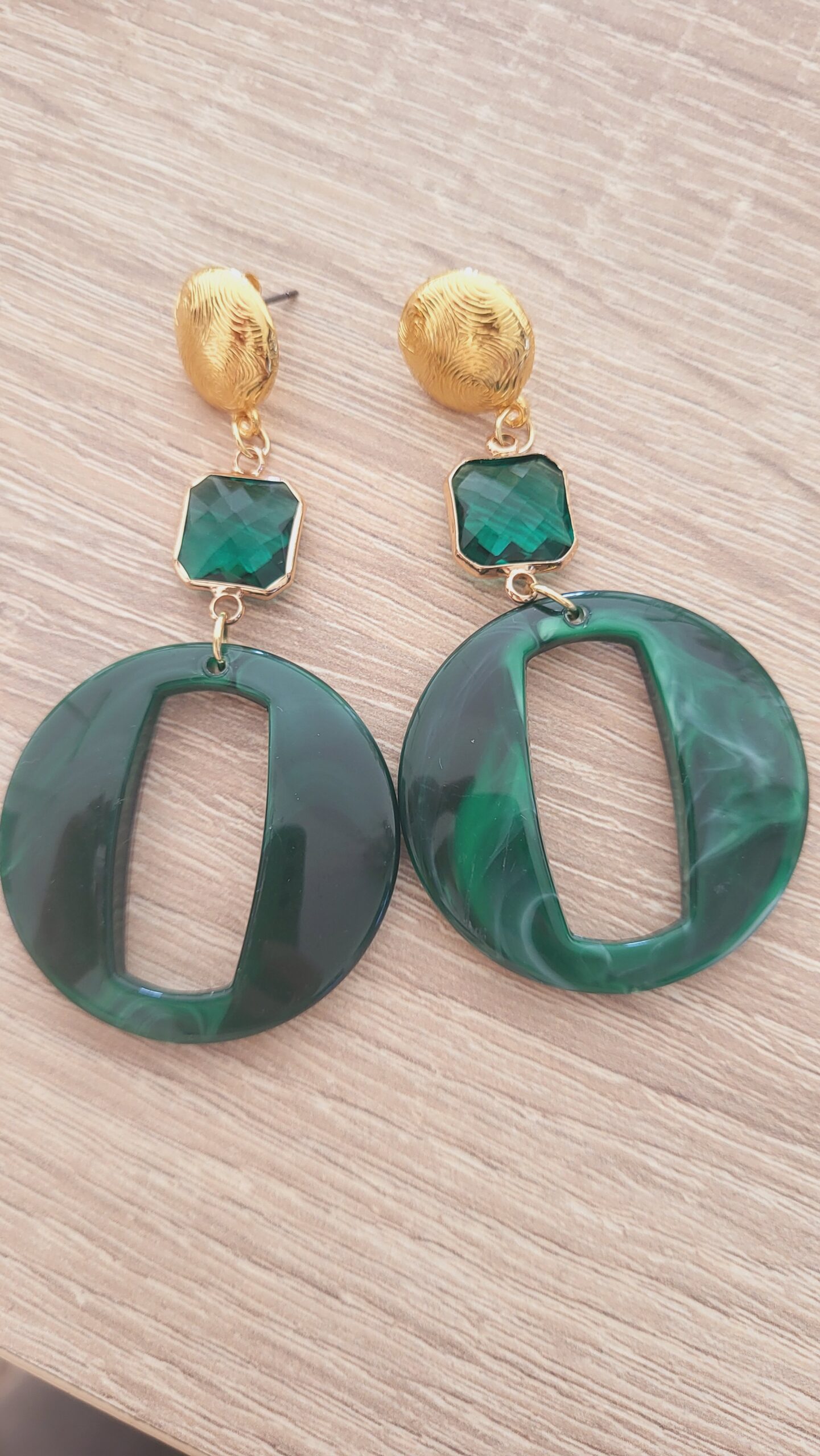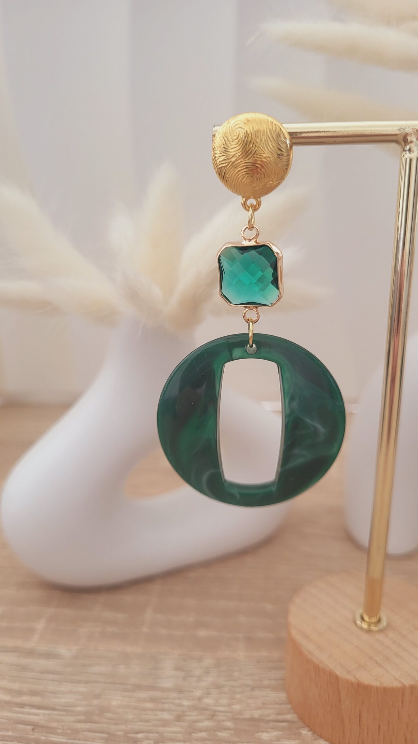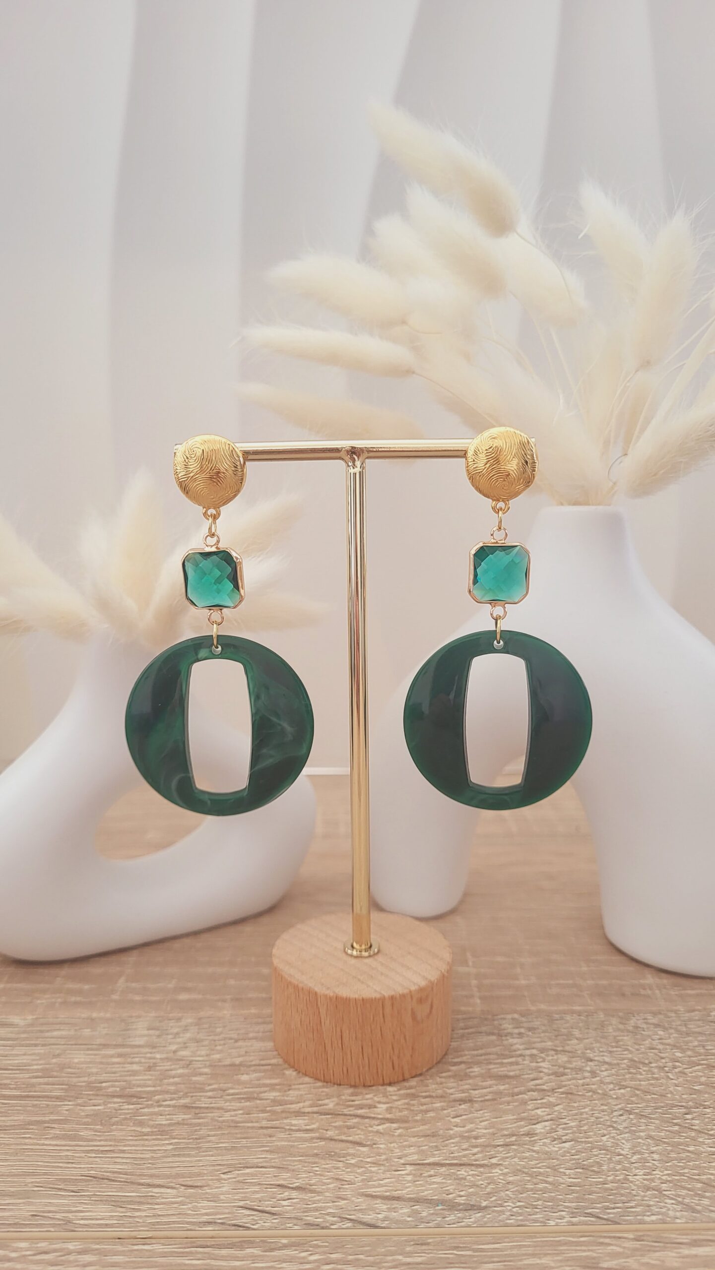 ✨️ Le modèle Olivia est un modèle de pendentif rond de 39 mm en résine avec un intercalaire rectangulaire en  erre de couleur vert en laiton or 18 carats.